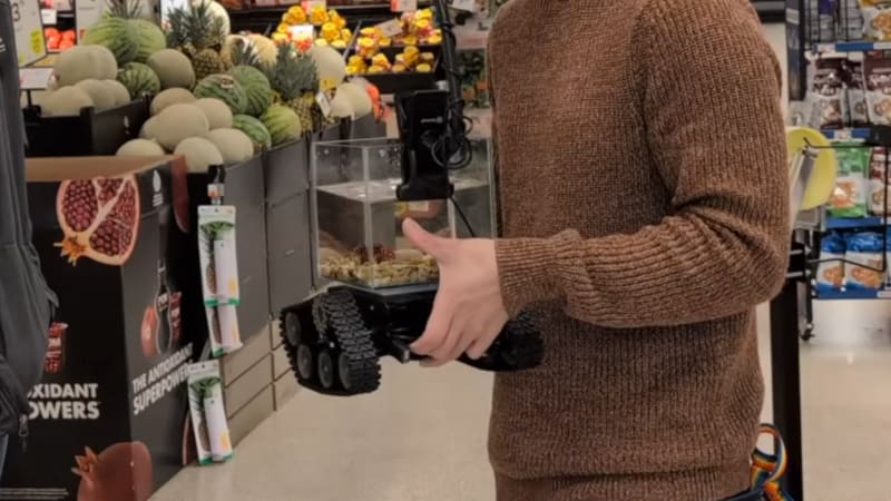 A hobbyist built a mobile fish tank that lets a betta fish named Carrot navigate the real world. The tank sits on a tracked, differentially-steered robot platform. Computer vision tracks the fish's movements inside the tank and translates them into drive commands. After solving issues like uncontrolled spinning when the fish