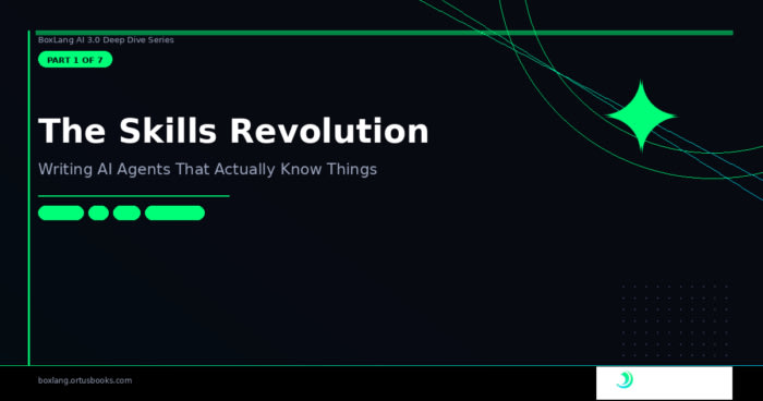 BoxLang AI 3.0 introduces an AI Skills system — a first-class implementation of Anthropic's Agent Skills open standard — that solves the problem of drifting, copy-pasted system prompts across agents. Skills are named, versioned knowledge blocks defined in SKILL.md files stored under .ai/skills/. They can be created from files,