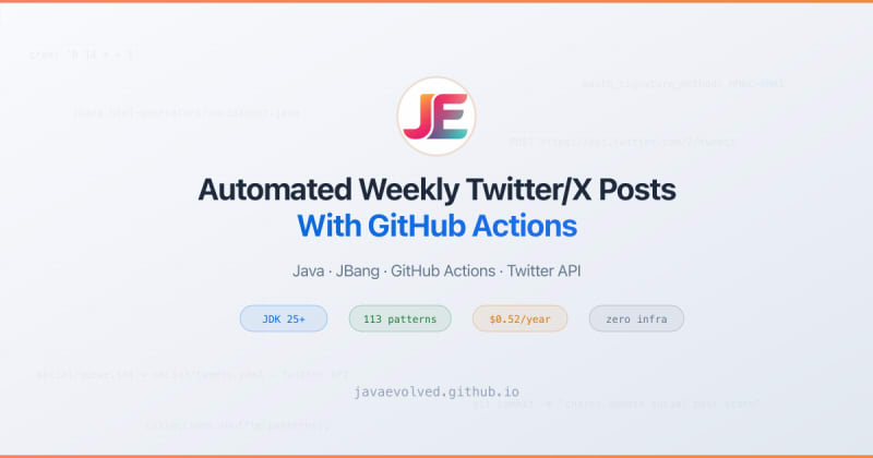 A walkthrough of automating weekly Twitter/X posts using Java, JBang scripts, and GitHub Actions — with no external servers or paid services. The system uses three components: a queue generator that shuffles 113 Java code patterns and pre-drafts tweets, a post script that handles OAuth 1.0a signing via Java's built-in