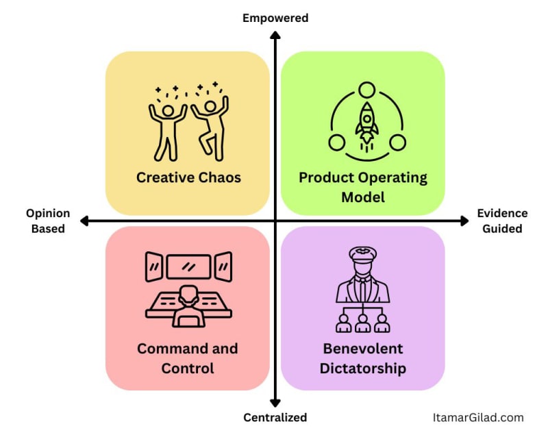 The Two Axes of Product Discovery1. Centralized + Opinion-Based: Command-and-Control2. Empowered + Opinion-Based: Creative Chaos3. Centralized + Evidence-Guided: Benevolent Dictatorships4. Empowered + Evidence-Guided: The Product Operating ModelIt’s Not That SimpleRelated ArticlesSort: