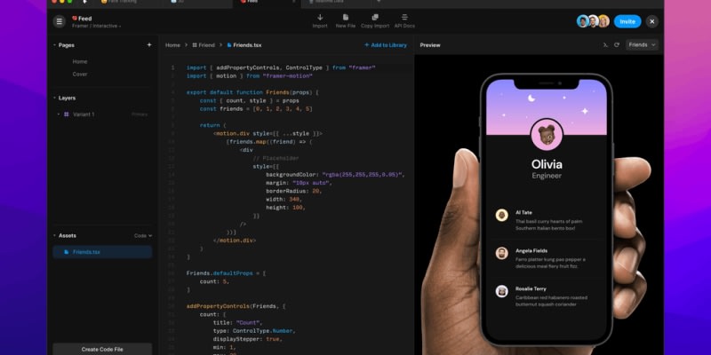 Introducing Framer For Developers. Your home for everything code in Framer. 10x faster code editor. NPM support (beta) Use Smart Components in code. Auto Size in code • Sharing code with a link. Explore the rest — framer.com/developers.