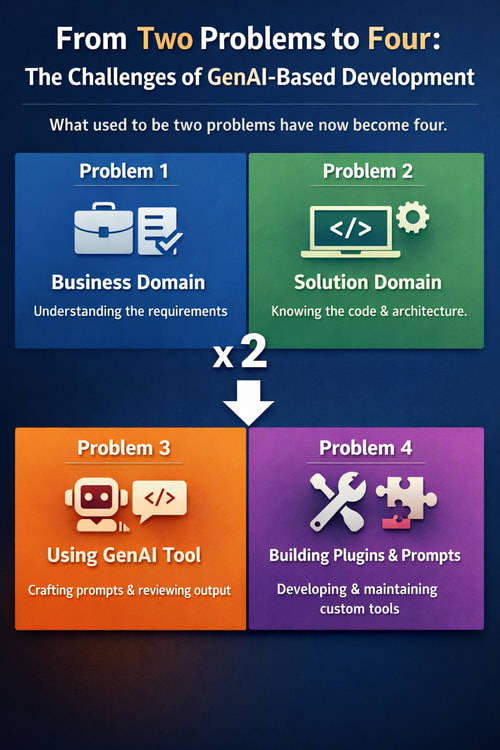 GenAI development tools don't reduce complexity—they add to it. Developers traditionally faced two challenges: understanding business requirements and the solution domain. GenAI introduces two more: learning to use the tool effectively through prompt engineering, and building systems to guide the tool itself through plugins and