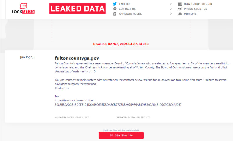 LockBit ransomware group threatened to publish Fulton County's internal documents but likely lost most of the data when their servers were seized by law enforcement.