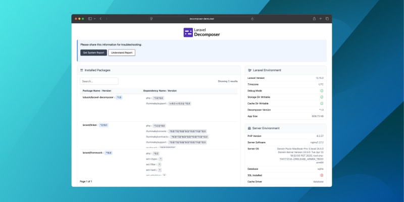 Laravel Decomposer is a development package designed to generate detailed application reports by listing Composer dependencies and other vital information such as PHP/Laravel versions and installed PHP modules. With the recent update, the package now supports the latest Laravel versions and features a revamped UI using Tailwind