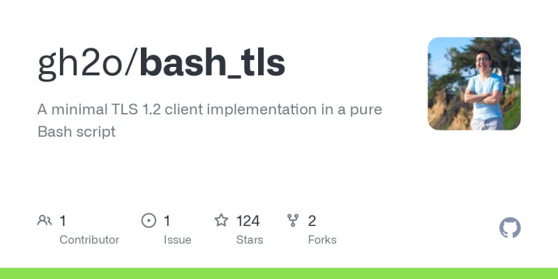 A minimal TLS 1.2 implementation in a pure Bash script that can make HTTPS requests to web servers with support for a single cipher suite and server name indication. It depends on bash, GNU bc, and sha256sum or shasum.