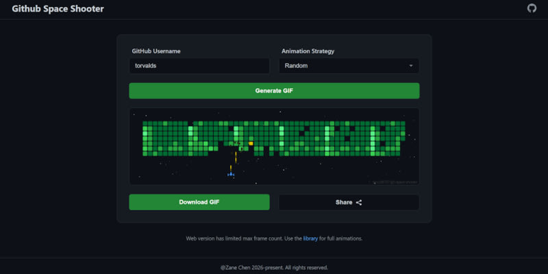GitHub Space Shooter transforms GitHub contribution graphs into an interactive space shooter game. Available as both a web app for one-time generation and a GitHub Action for scheduled automated generation. The project is a fun visualization tool rather than solving a practical problem.