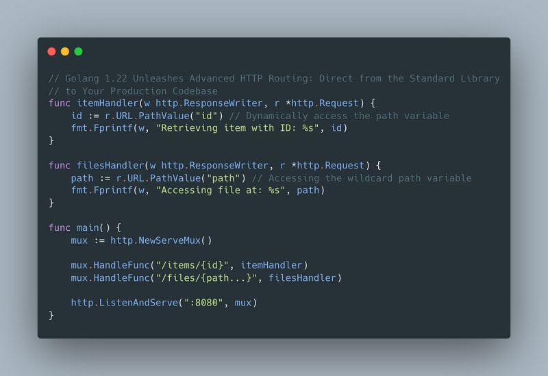 Golang 1.22 Unleashes Advanced HTTP Routing: Direct from the Standard Library to Your Production CodebaseEnhanced Routing Patterns: A Closer Look1. Method-Based RoutingExample:2. Wildcard Support in URL PatternsSingle Segment Wildcard Example:Multi-Segment Wildcard Example:Routing Precedence and Special CasesCompatibility and TransitionPractical ImplementationReferencesSort: