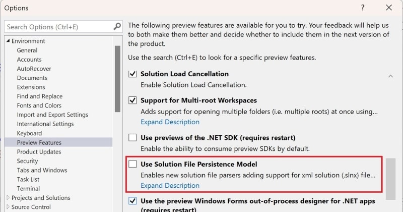 With .NET 9 SDK (9.0.200), Microsoft introduces a new XML-based solution file format (.slnx), replacing the older .sln files. The .slnx file is simpler and cleaner, eliminating issues related to GUIDs. Users can enable this feature through the Visual Studio Preview Features settings, migrate existing .sln files, or create new