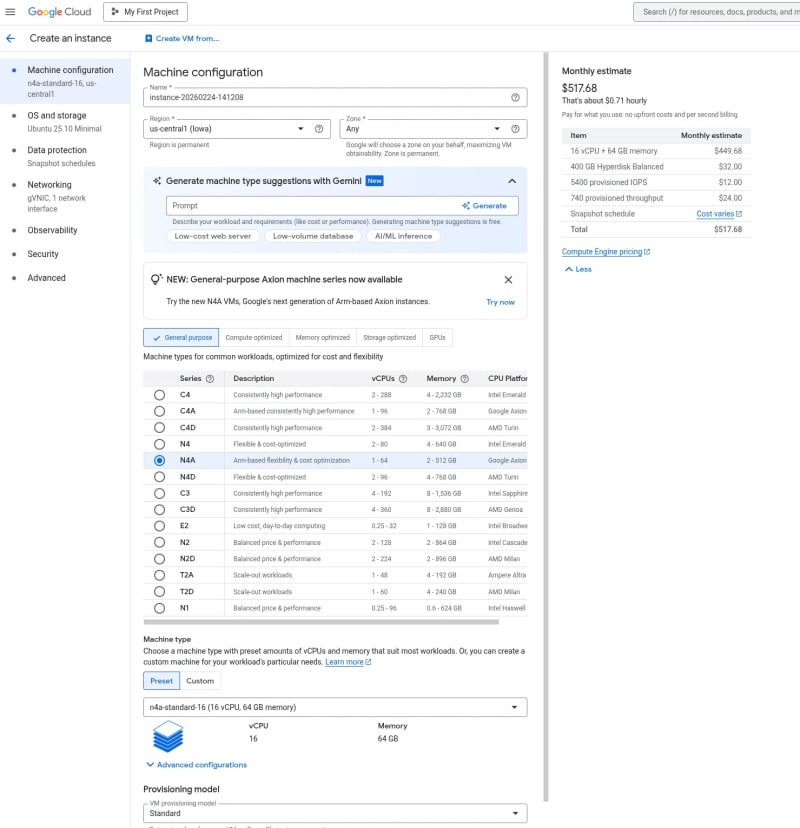 A performance comparison of Google Cloud's N4-series VMs using 16 vCPU instances: the N4A powered by Google's in-house Axion ARM64 processor, the N4 powered by Intel Xeon Emerald Rapids (Platinum 8581C), and the N4D powered by AMD EPYC Turin (Zen 5, 9B45). All instances ran Ubuntu 25.10 with 400GB storage. Beyond raw benchmark