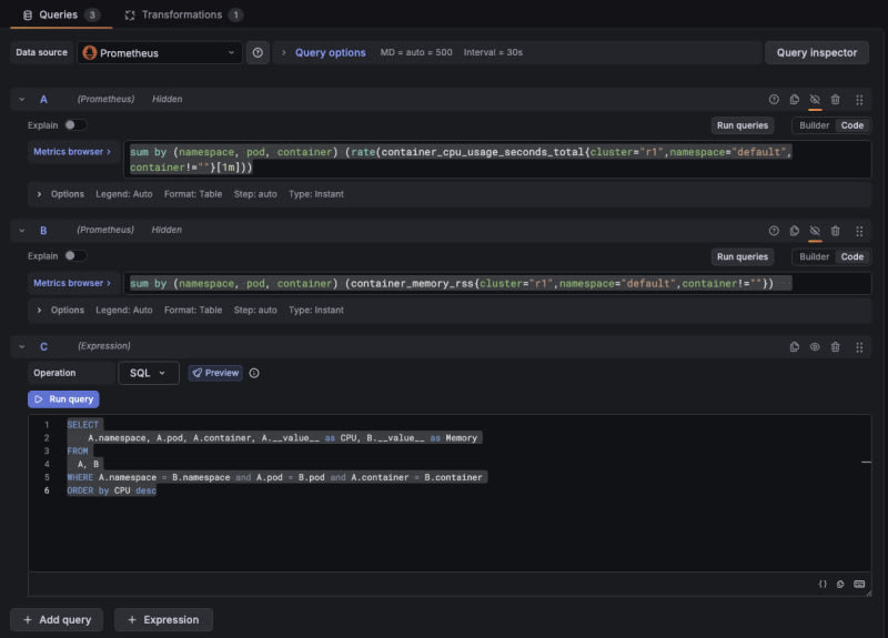 Grafana's SQL Expressions feature (available in Grafana 12 as optional, default in Grafana 13) lets you run SQL queries directly against the results of other queries in a panel. This replaces multiple data transformations with a single SQL JOIN, making it easier to combine Prometheus metrics like CPU and RAM into a unified