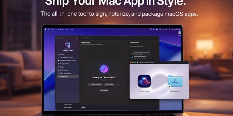 Gravity DMG is a GUI tool that simplifies creating, signing, and notarizing DMG packages for macOS applications. It replaces complex command-line tools like notarytool and hdiutil with a visual interface featuring layout presets, one-click notarization through Apple's API, and system Keychain integration for secure credential management.