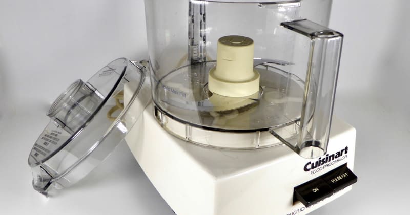 The original Cuisinart food processor exemplifies excellent interface design through its simple two-button system: an ON button that latches for continuous operation, and a PULSE/OFF button that springs back when released. The large paddle buttons provide clear affordances, work with any hand condition, and demonstrate how