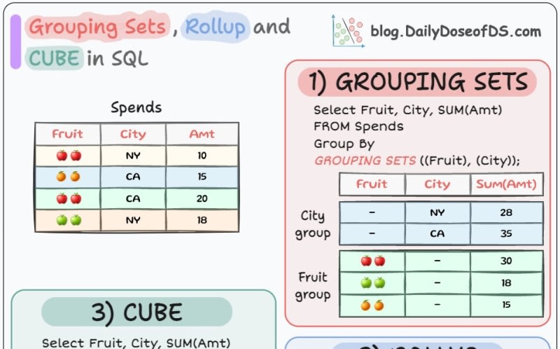 This post discusses three lesser-known grouping operations in SQL: Grouping Sets, Rollup, and Cube. These operations allow for efficient multiple aggregations on the same table, generating subtotals, grand totals, and all possible combinations of aggregations. The order is important in ROLLUP, and CUBE creates a result set with all possible combinations.