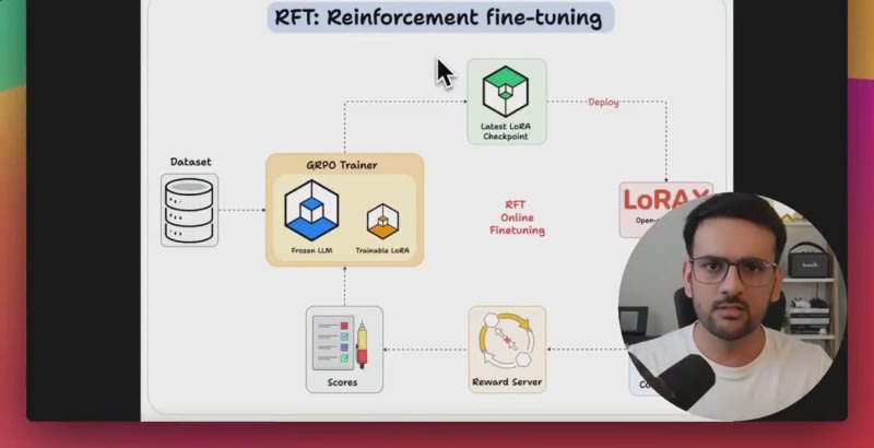 Reinforcement fine-tuning (RFT) allows the transformation of open-source LLMs into advanced reasoning models without needing labeled data. The post guides using Predibase for RFT to enhance Qwen-2.5:7b. It contrasts RFT with supervised fine-tuning (SFT), highlights the steps involved in setting up and training using the