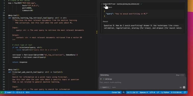 A step-by-step implementation guide for building an Agentic RAG system using the Model Context Protocol (MCP). The system combines vector database search with web search fallback, using Firecrawl for web scraping, Qdrant as the vector database, and Cursor as the MCP client. The tutorial covers setting up an MCP server, creating