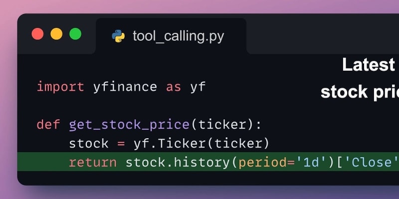 Tool calling allows language models to perform specific tasks by invoking external tools or APIs. The process involves recognizing when an external tool is needed, invoking the tool, and integrating its output into the model's response. This enhances the flexibility and capability of LLMs. A demo is provided to build a stock price retrieval assistant using the yfinance library.