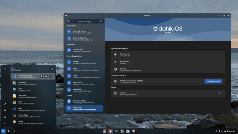 DahliaOS is designed to run on either the Linux or Zircon kernels. It’s purported to be very lightweight (thanks to build root) and run on as little as 199 MB of RAM when idle. The system uses the custom Pangolin desktop environment for the default UI.