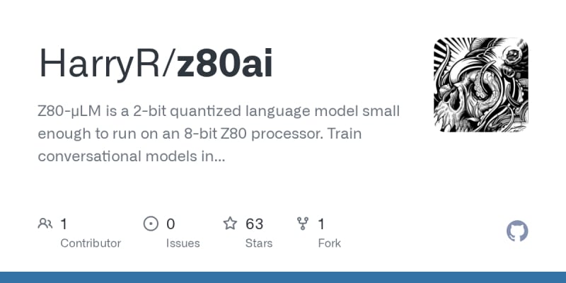 Z80-μLM is a 2-bit quantized language model designed to run on an 8-bit Z80 processor with 64KB RAM, packaged as a 40KB CP/M binary. The project uses trigram hash encoding for input, 2-bit weight quantization, and 16-bit integer inference without floating-point operations. It includes pre-built examples like a conversational