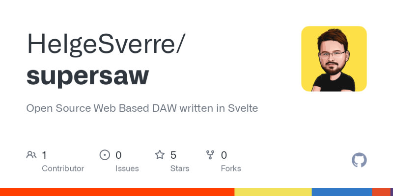 Supersaw is an open-source, web-based music production tool designed for fun and educational purposes. Built using Svelte, Tailwind CSS, and Vite, it leverages the Web Audio API and Web MIDI API. Geared towards developers interested in DSP, music theory, and sound engineering, it's a hobby project that invites contributions while encouraging forking for individual projects.