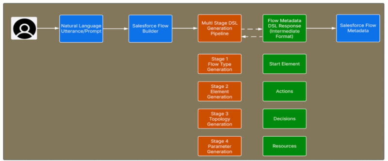 Salesforce's Agentforce team replaced fine-tuned models with a constrained, multi-stage Domain-Specific Language (DSL) architecture to generate production-ready Flow automation from natural language. The new approach separates planning (Architect phase) from implementation (Developer phase), enforces strict validation at each