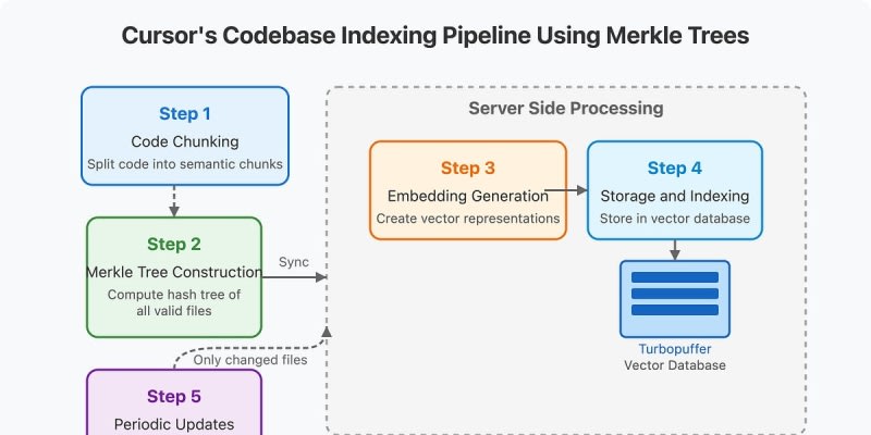 Cursor, an AI IDE, utilizes Merkle trees to efficiently index codebases by chunking code into semantically meaningful pieces, synchronizing them with a server, and generating embeddings for fast, privacy-preserving retrieval. This structure allows efficient incremental updates and verification of data integrity, optimizing