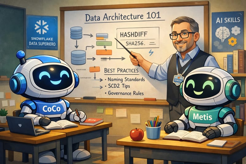 A veteran data architect argues that AI code generation tools like Snowflake's Cortex Code accelerate development but risk scaling inconsistency without enterprise standards baked in. The solution is Cortex Code 'Skills' — structured, executable instructions that encode architectural decisions like hashing algorithms, naming