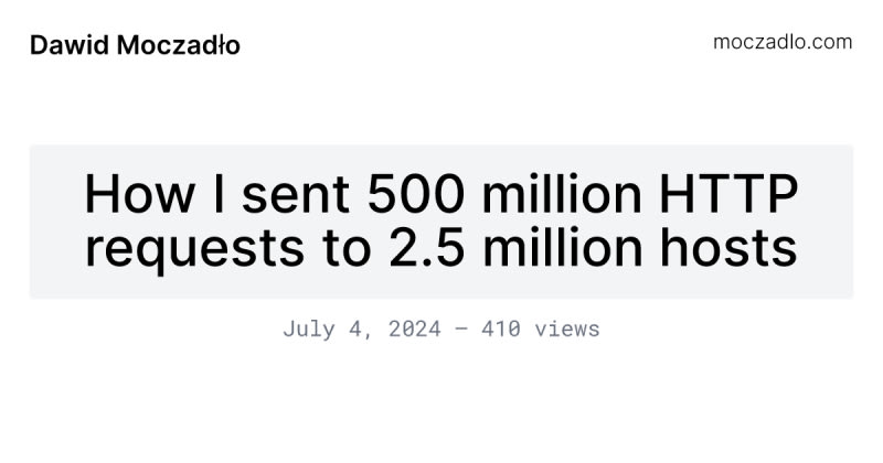 How much is 500 million HTTP/1.1 requests?What does it mean to send a single HTTP/1.1 request?How much time does it take to send a single HTTP request?How can we optimize it?Designing the HTTP/1.1 sending cannonChoosing right HTTP libraryOptimizing the librarySkipping DNS resolutionTLS handshake optimizationSplitting the work into chunksScalling the cannon with KubernetesDDoS as a ServiceAvoiding detectionConclusion1 Comment