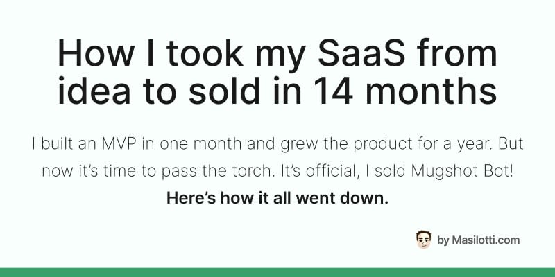 Joe Masilotti built Mugshot Bot in one month and grew the product for a year. After four months of parental leave, he officially posted MugshotBot for sale in November. He hopes to use the money to spend as much time as possible with his family.