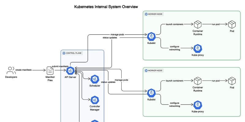 Kubernetes is an open-source container orchestration platform designed to automate the deployment, scaling, and management of applications. Developers interact with Kubernetes using manifest files to define the desired state of their applications. The Control Plane, including components like the API Server, Scheduler,