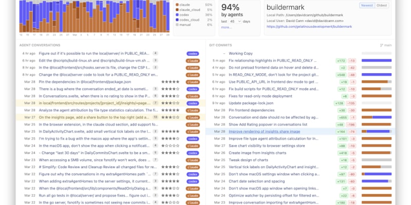 Buildermark is an open source tool that measures how much of your codebase is written by AI coding agents. It works by matching agent diffs with git commits to calculate the percentage of AI-generated code. It also archives all conversations from agents like Claude Code, Codex, Gemini, and Cursor. A live demo shows 364 agent