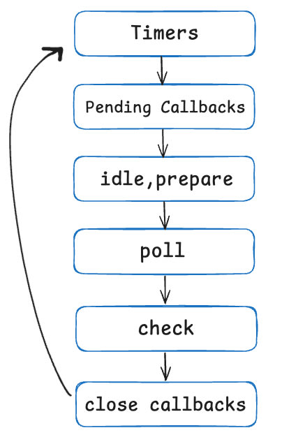 Node ExecutionEvent Loop (Simplified)The Main ModulePhases OverviewTimers PhasePending CallbacksIdle, prepare phasePoll phaseCheck PhaseClose Callbacks PhaseSort: