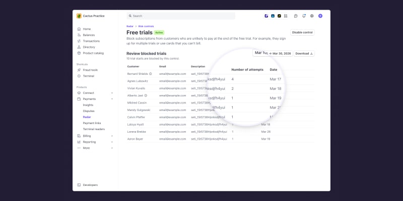 Stripe Radar now includes a one-click free trial abuse prevention feature powered by an AI model trained on payment instrument, device, and payment history data across Stripe's network. The tool detects abusive behaviors like repeated trial signups and invalid payment methods with 90% accuracy. Free trial abuse has grown 6.2x