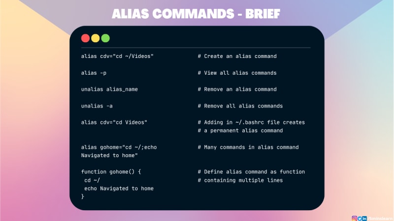 Learn to create your own commands in Linux using alias commands. Improve productivity by setting up helpful alias commands. Explore how to view, remove, and create permanent alias commands. Run multiple commands in a single alias command for efficiency.
