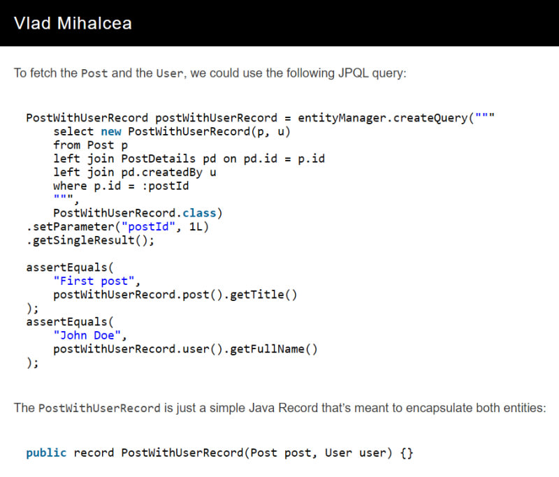 When you need to fetch a root entity along with an optionally associated entity through an intermediate join table, standard LEFT JOIN FETCH won't work if the intermediate entity is optional. The solution uses a JPQL query with a Record-based projection (Java Record) that wraps both the root entity and the optional entity. The