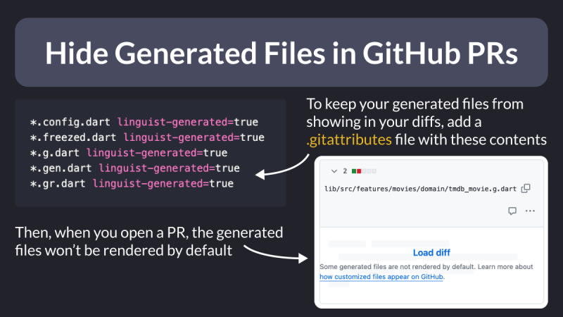 Learn how to hide generated Dart files in GitHub PRs by adding them to a .gitattributes file at the root of the project.