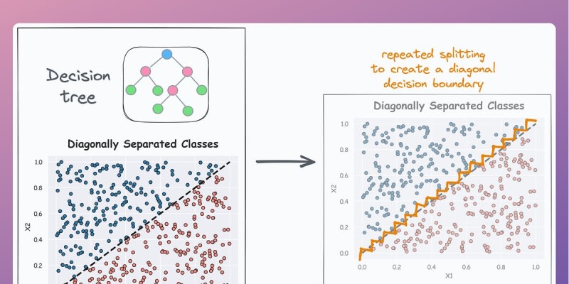 Decision trees often create perpendicular split conditions which can lead to overfitting, particularly with diagonal decision boundaries. Running PCA before fitting a decision tree can project data into orthogonal space, potentially reducing the tree's depth and improving performance. However, PCA components are not