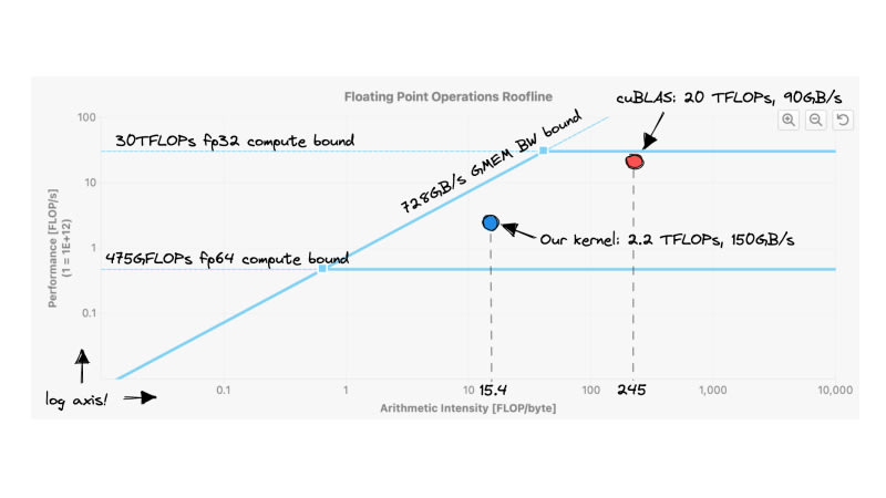 The post provides a detailed, iterative approach to optimizing a CUDA matrix multiplication (matmul) kernel to achieve performance close to NVIDIA's cuBLAS library. It covers topics like coalescing global memory accesses, utilizing shared memory, occupancy optimization, and achieving higher arithmetic intensity. Included are