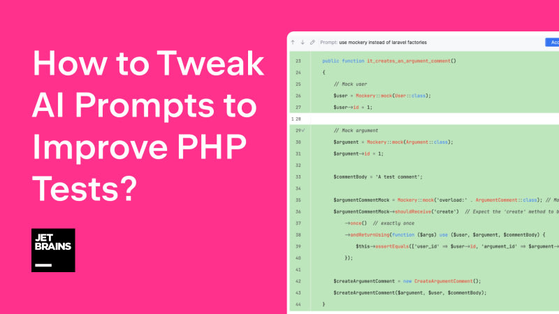 Learn how to tweak AI prompts to improve PHP tests and get the desired code output. AI Assistant can generate code that fits within your project, but sometimes you may want to give it hints about the outcome. Fine-tuning prompts and not over-specifying them can lead to productive code generation. AI Assistant learns from your prompts over time.