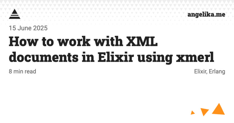 A comprehensive guide to using Erlang's xmerl library in Elixir for XML document manipulation. Covers parsing XML strings to xmlElement records, defining necessary record types, traversing and updating XML elements, and exporting back to strings. Includes practical examples of finding elements by ID, modifying attributes, and