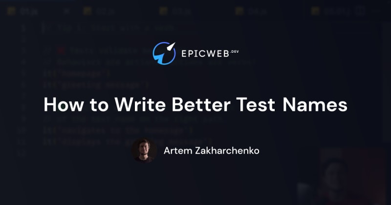 Tips for writing better test names: start with a verb, use subject-less third person, omit implied verbs, describe the intention not the implementation, and keep it short. Long test names may indicate that the test is doing too much and should be split into smaller tests.