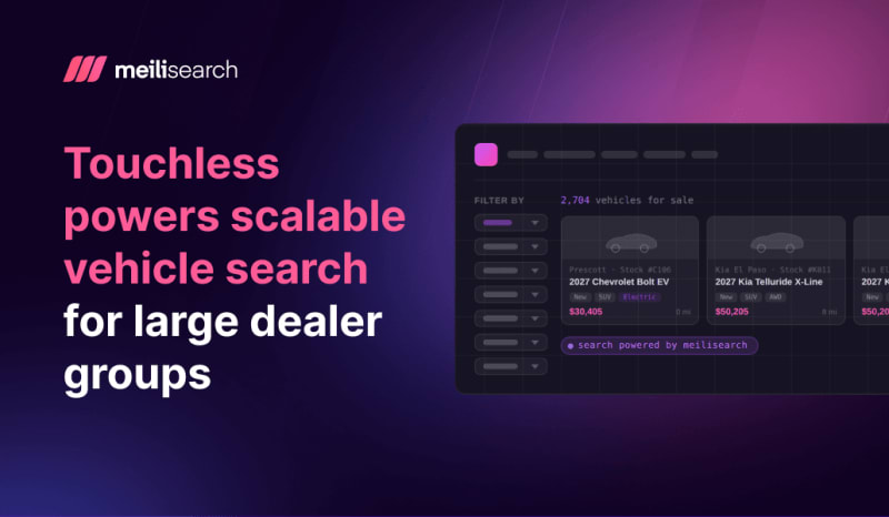 Touchless, a Toronto-based automotive tech company, uses Meilisearch to power vehicle inventory search for large dealer groups. Their marketplace platform serves dealer groups with 3,000–9,000 vehicles per group across ~100 locations. Key reasons for choosing Meilisearch over Algolia include API flexibility, seamless