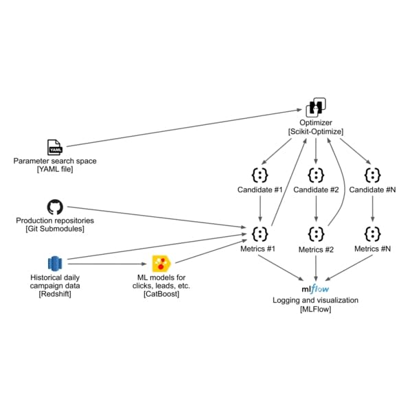 Yelp developed a back-testing engine to safely simulate changes to their ad budget allocation system before deploying them to production. The system replays historical campaign data day-by-day using production code, ML models (CatBoost) to predict outcomes like clicks and leads, and Bayesian optimization (Scikit-Optimize) to