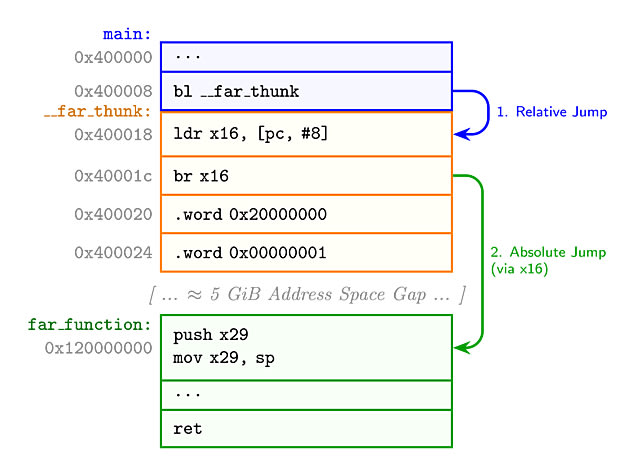 Linker thunks (trampolines) offer a solution for building huge static binaries beyond 2GiB on x86_64 without switching to the large code model. While architectures like AArch64 already use thunks due to instruction size limitations, x86_64 lacks this support despite its potential benefits. Thunks allow most code to remain in