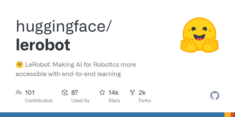 LeRobot is an open-source PyTorch library by Hugging Face that democratizes AI robotics through end-to-end learning. It provides state-of-the-art models, datasets, and tools for real-world robotics, featuring pretrained policies like ACT, Diffusion Policy, and TDMPC. The library includes affordable hardware projects like the