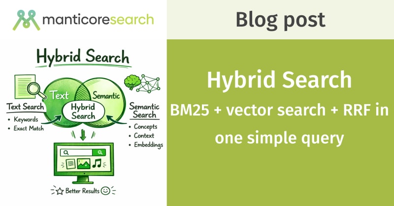 Hybrid search combines full-text (BM25) and vector (KNN) search in a single query, covering the blind spots of each method. Manticore Search implements this using Reciprocal Rank Fusion (RRF), which merges ranked result lists without needing to normalize scores across different scales. The post explains when hybrid search is