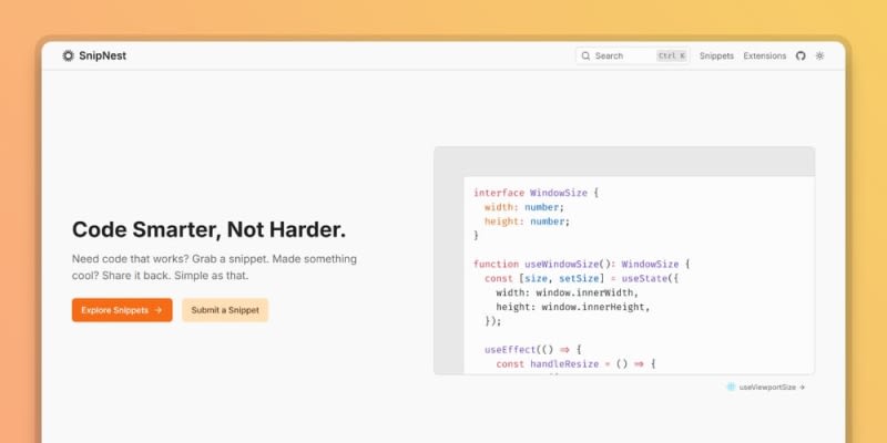 SnipNest is an open-source collection for storing and sharing code snippets, created to alleviate the frequent need to search for the same solutions repeatedly. It uses MDX files for organizing snippets with metadata and offers a Visual Studio Code extension for easy access. The project encourages community contributions to expand its repository.