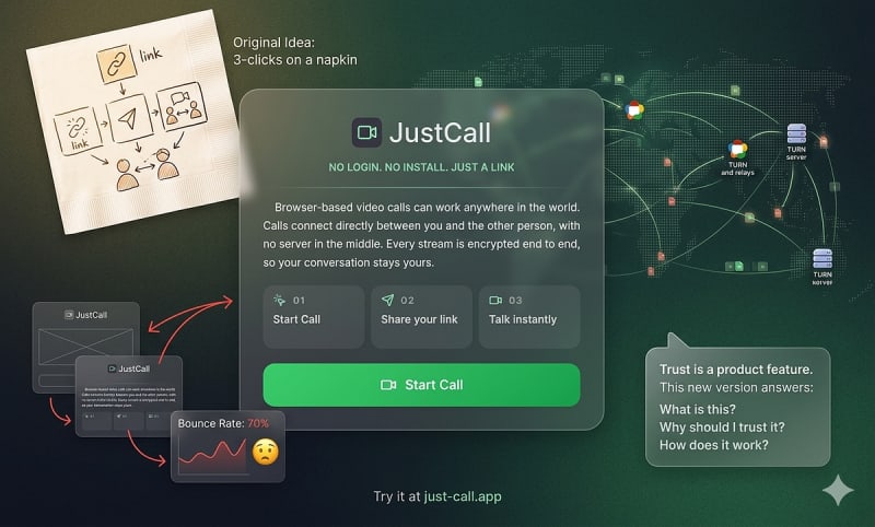 A developer built a browser-based video calling app called JustCall after struggling to video call his mother across Android/iPhone platforms. The post covers the technical challenges of cross-border WebRTC (NAT traversal, TURN server fallback, UDP throttling) and a key product lesson: after launching, a 70% bounce rate