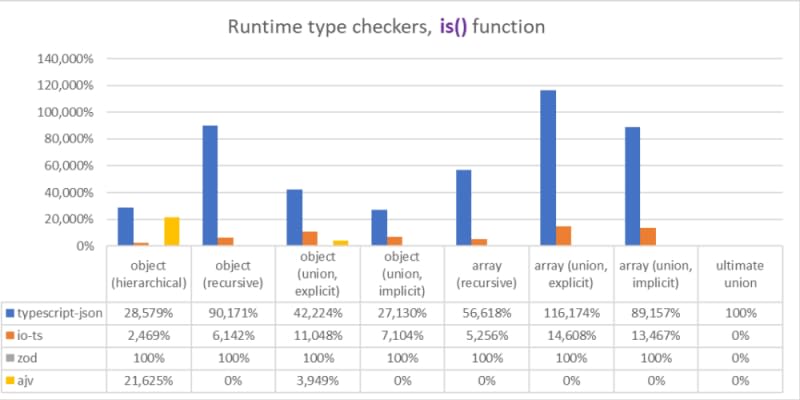 typescript-json is much faster and much easier to use than io-ts and zod. The benchmark has been turned out that maximum 1,000x faster than zod. I hope many TypeScript developers will adapt my library to adapt it. The number means that how many jobs have done in one second.