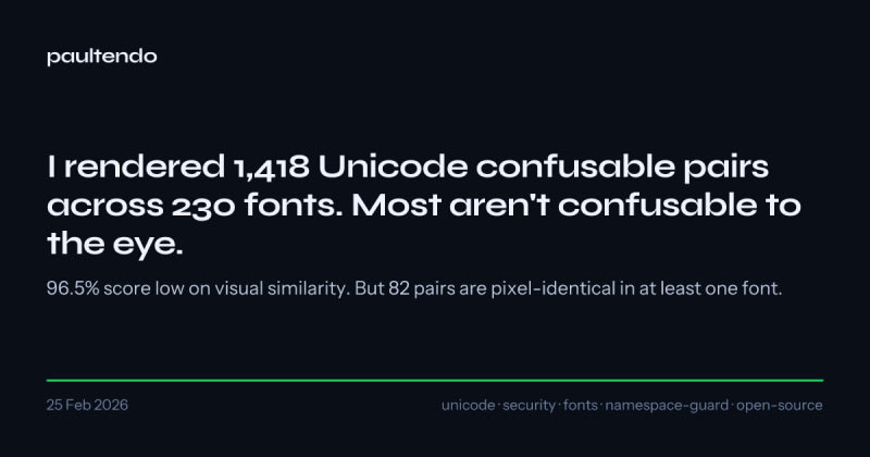 A developer built confusable-vision, a tool that renders all 1,418 Unicode TR39 confusable pairs across 230 macOS system fonts and measures visual similarity using SSIM. Key findings: 96.5% of confusables.txt entries are not visually high-risk, but 82 pairs are pixel-identical in at least one font. Core Cyrillic homoglyphs (а,