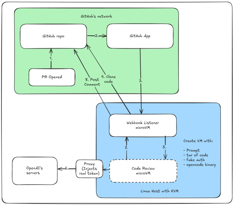 Alex Ellis built a self-hosted AI code review bot as an alternative to GitHub Copilot's native PR review feature. The bot uses Firecracker microVMs (via SlicerVM) to safely isolate code execution, clones the PR code into a short-lived VM, runs the opencode CLI against an LLM (e.g., Grok Coder Fast 1), and posts the review as a